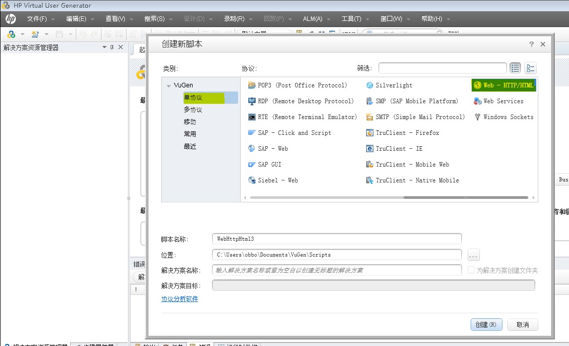 打开Virtual User Generator ,使用组合键Ctrl+N打开如下对话框,选择单协议→Web-HTTP/HTML,填写脚本名称和保存位置后,点击创建。